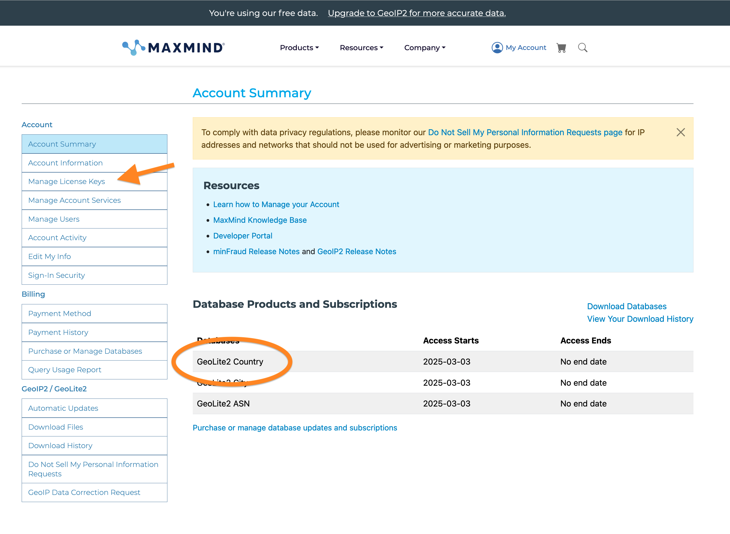 - Check that you have access to the GeoLite2 Country database, it should be included in the list.